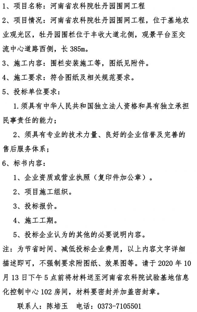 河南省农科院现代农业科技试验示范基地 牡丹园围网工程询价公告