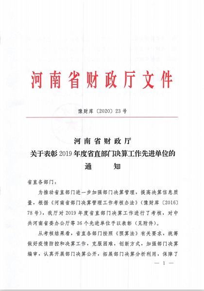 近日,省财政厅发文通报,经过考核,我院荣获“2019年度省直部门决算工作先进单位”表彰。