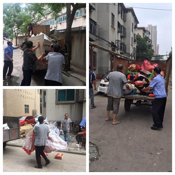 7月9日,安保部组织人员对家属区楼道里堆放的杂物进行清运。
