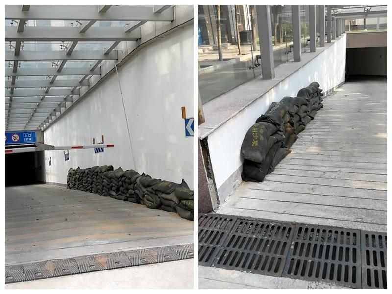 7月21日,雨季来临之际,安保部在易积水位置提前堆放防汛沙袋,防患于未然。