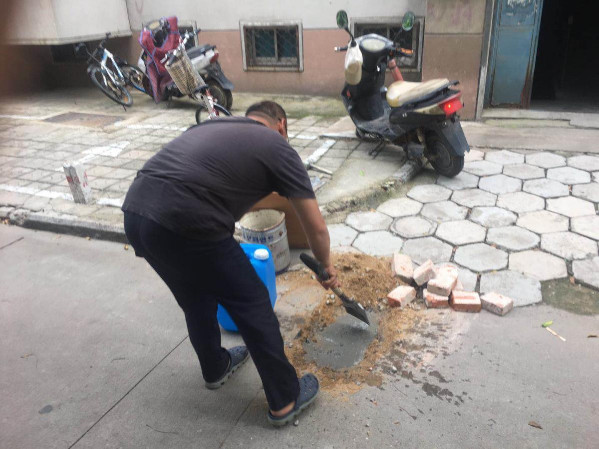 维修师傅对家属区破损路面进行修补,确保行人通行安全。