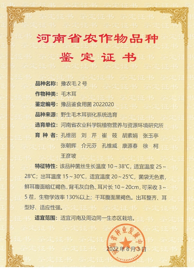 品种介绍:该品种系在野生采集基础上经系统选育而成,该品种菌丝生长温度10~40℃,适宜温度25~28℃;出耳温度10~30℃,适宜温度20~25℃,菌袋无色素,鲜耳腹面暗红褐色,背毛浓密灰白色,干耳腹面黑褐色,耳片长10-14cm。 品种优势:该品种通过2022年省鉴定,具有出耳整齐、耳性好、抗性强,适宜条件下,生物学效率130%以上等特点。 成果单位:24足球直播食用菌研究所 联 系 人:孔维丽13838241202