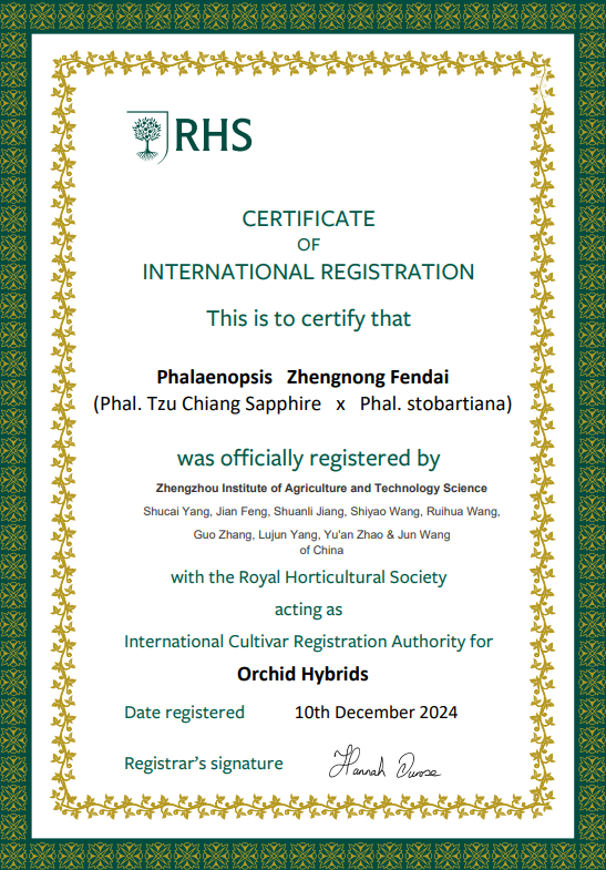 据悉,英国皇家园艺协会(RHS)是世界上唯一的、权威的兰花新品种登录机构,该机构只登录首次育成的兰花属间和种间杂交种,而获得国际品种登录证书意味着该品种成为国际收录并承认的新品种,具有重要的学术意义。