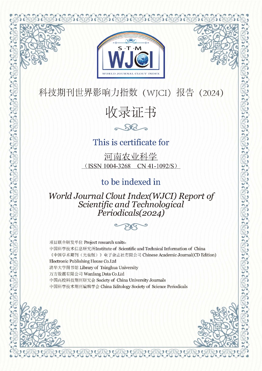 《WJCI报告》是由中国科学技术信息研究所、《中国学术期刊(光盘版)》电子杂志社有限公司、清华大学图书馆、万方数据有限公司、中国高校科技期刊研究会、中国科学技术期刊编辑学会联合研制的期刊评价报告,是一份体现世界期刊同台竞技结果的期刊评价报告,入选期刊均被认为是具有地区代表性和学科代表性的优秀期刊。《WJCI报告(2024)》经过严格评议,收录了全球15936种科技期刊,其中中国期刊1858种,WJCI指数均值为1.649,位居世界第六。《河南农业科学》的连续入选标志着国际影响力和学术影响力的持续提升。