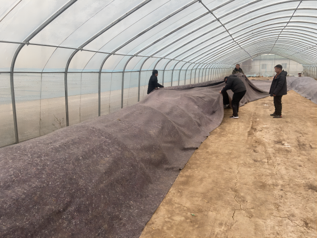 在夏邑县王集镇彭井村,小分队查看了河南农科院“优特计划”示范基地宝存种植专业合作社大棚春白菜育苗防寒管理情况,帮助基地负责人覆盖毡棉、紧固棚体、压严棚膜,并提出了在棚内张挂二膜和增加出入口风挡等保温措施。