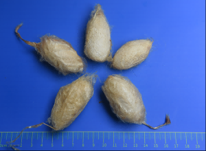 成果简介: 豫早4号为黄蚕血统,一化性,4眠5龄。卵壳乳白色,椭圆略扁,蚁蚕头壳红褐色,体黑色,5龄期蚕体背香蕉黄色,体侧金瓜黄色,气门上线淡可可棕色,雌蚕体长74.16 ㎜,体幅18.52 ㎜,体重24.65 g;雄蚕体长68.86 ㎜,体幅17.36 ㎜,体重19.81 g。茧淡黄褐色,长椭圆形。蛹黄褐色,少数淡褐色。雌蛾山鸡黄色,雄蛾火岩棕色。克卵数104粒,卵期发育有效积温为122 ℃。实用孵化率91.93%,普通孵化率96.90%,不受精卵率2.03%。蛾羽化齐,交配性能好。茧丝长1067.31 m,解舒率64.38%,解舒丝长687.14 m,回收率61.50%,百粒茧纤维公量108.04 g,鲜茧出丝率6.93%。