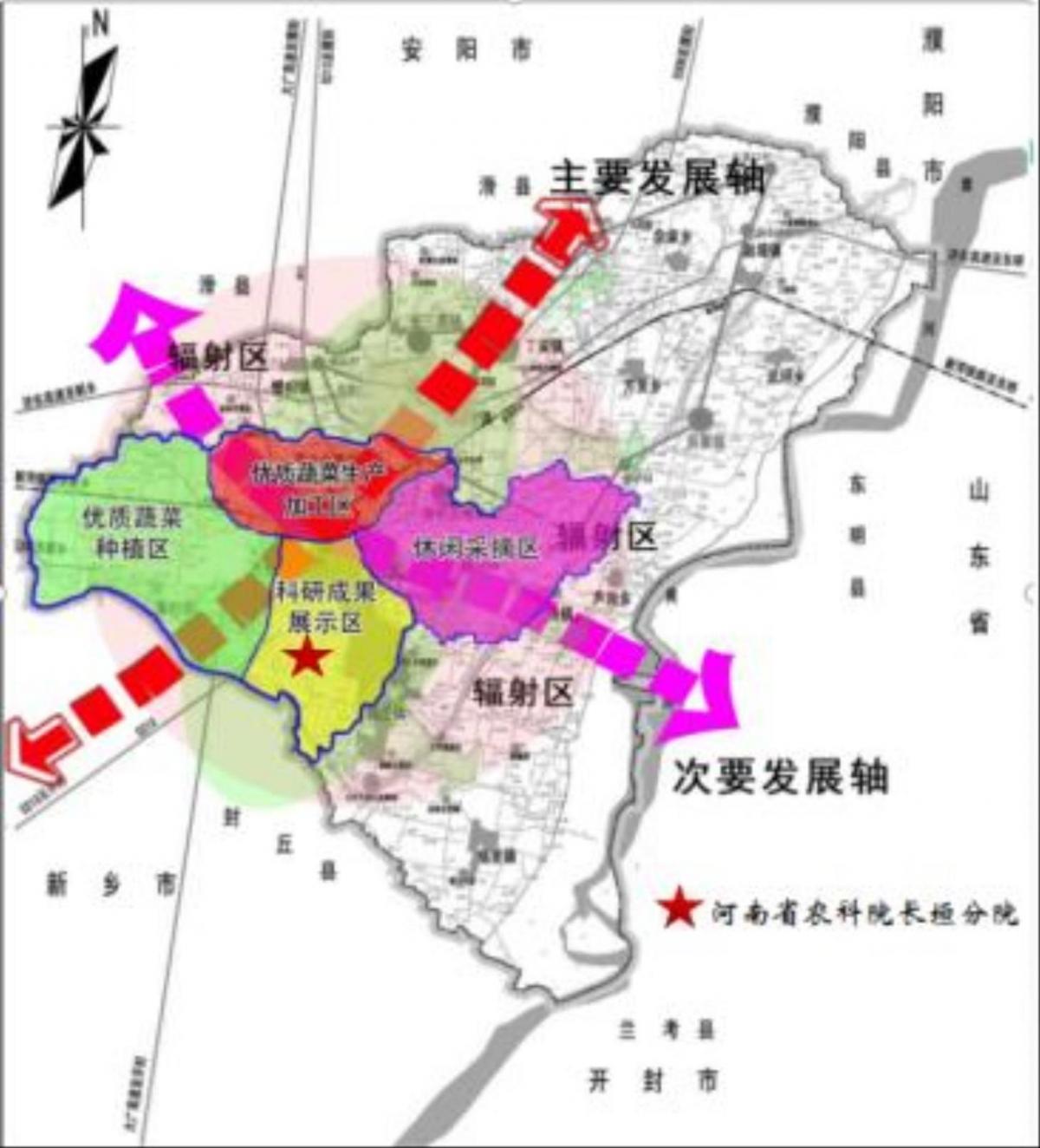 技术研发核心区:以河南省农科院长垣分院为核心,主要功能是蔬菜品种的引种、繁育、育苗和技术培训等。