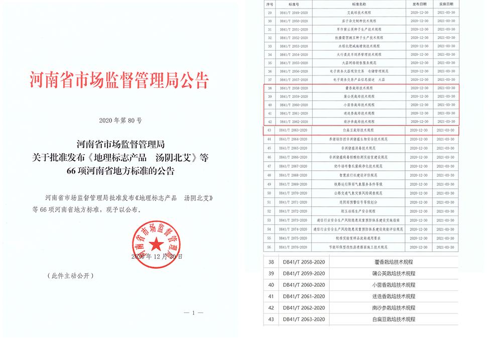 2020年12月22日-23日,河南省市场监督管理局在郑州组织召开河南省地方标准审查会议,与会专家听取了《蒲公英栽培技术规程》、《小茴香栽培技术规程》、《白扁豆栽培技术规程》、《迷迭香栽培技术规程》、《南沙参栽培技术规程》和《藿香栽培技术规程》的编制情况汇报,并对这六项标准送审稿进行了认真审查,一致通过了6项地方标准审查。经河南省市场监督管理局审核后,于2020年12月30日批准发布。