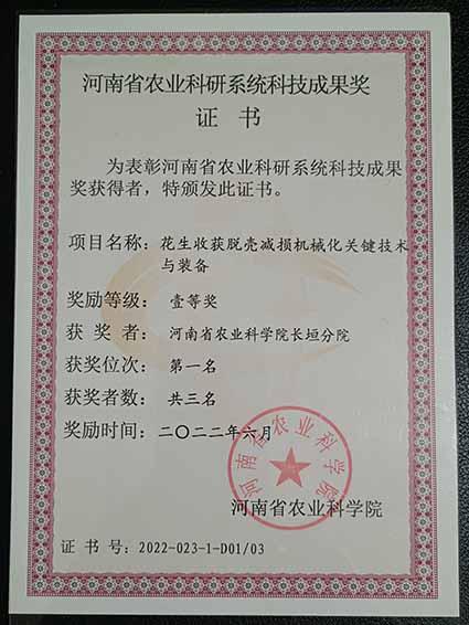 目前,2022年度河南省农业科研系统科技成果奖评审工作已经结束,共评审出一等奖23项,二等奖20项,三等奖4项。24足球直播长垣分院智能农机装备研究团队主持的“花生收获脱壳减损机械化关键技术与装备”项目荣获“河南省农业科研系统科技成果奖一等奖”。