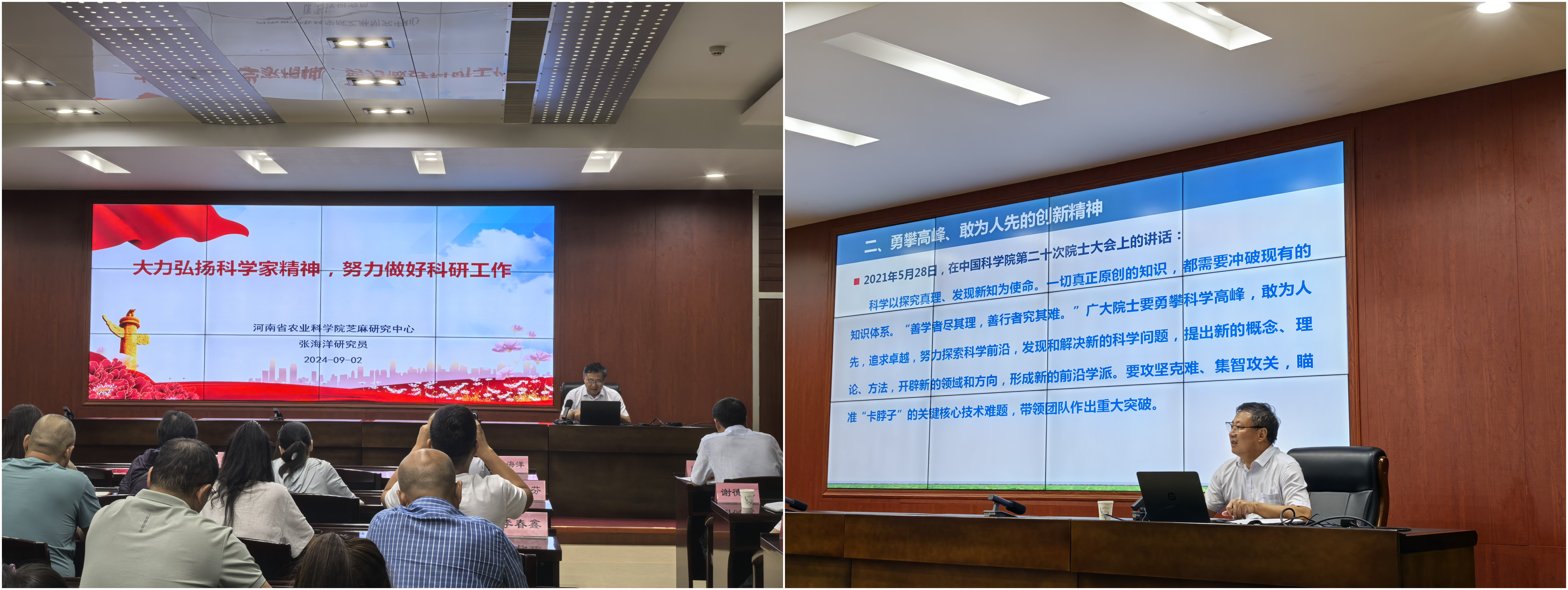 本次宣讲会由院直属单位党委主办,经济作物研究所和芝麻研究中心共同承办,邀请国家特色油料产业技术体系首席科学家、芝麻中心主任张海洋研究院,结合芝麻研究的亲身经历,精准阐述了科学家精神与《新时代公民道德建设实施纲要》及职业道德建设的紧密联系,总结了培养科学素质、融入科研团队、选好研究方向、建好研发平台、提高能力效率的五大实践经验,与在座青年科技工作者共勉。