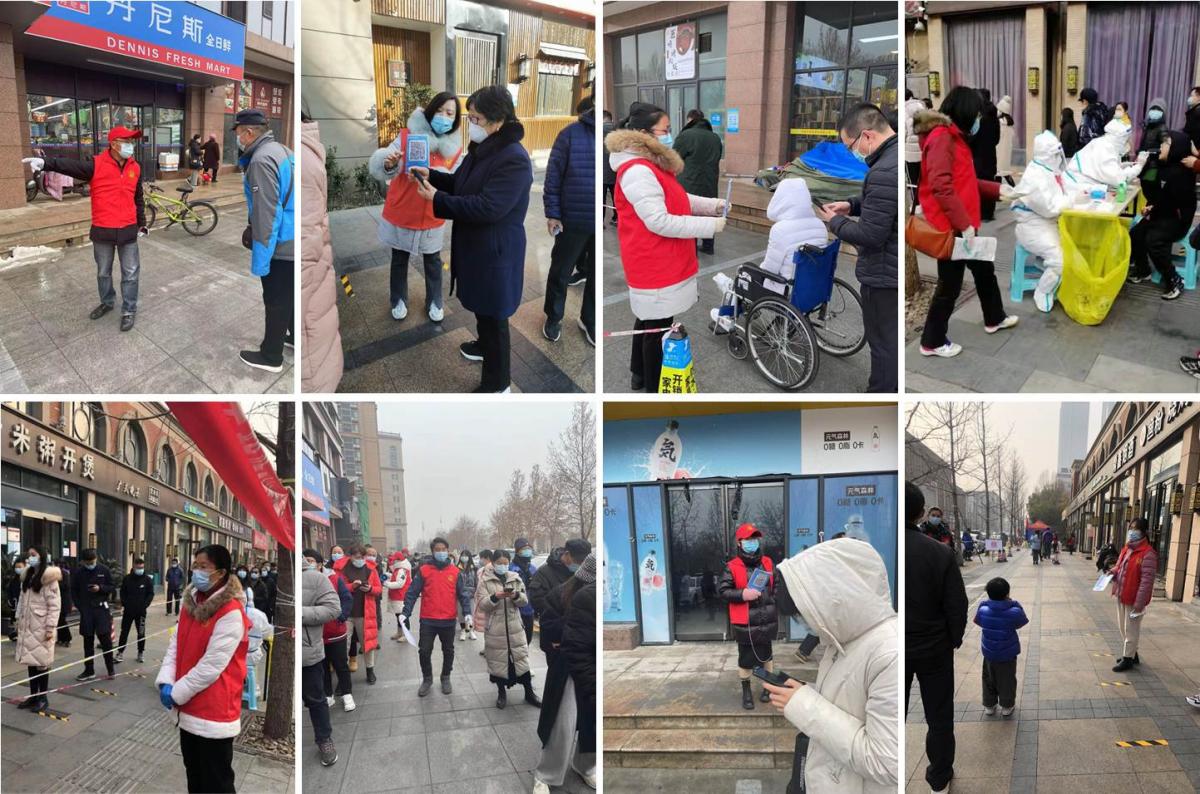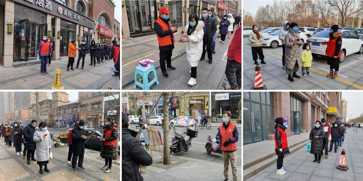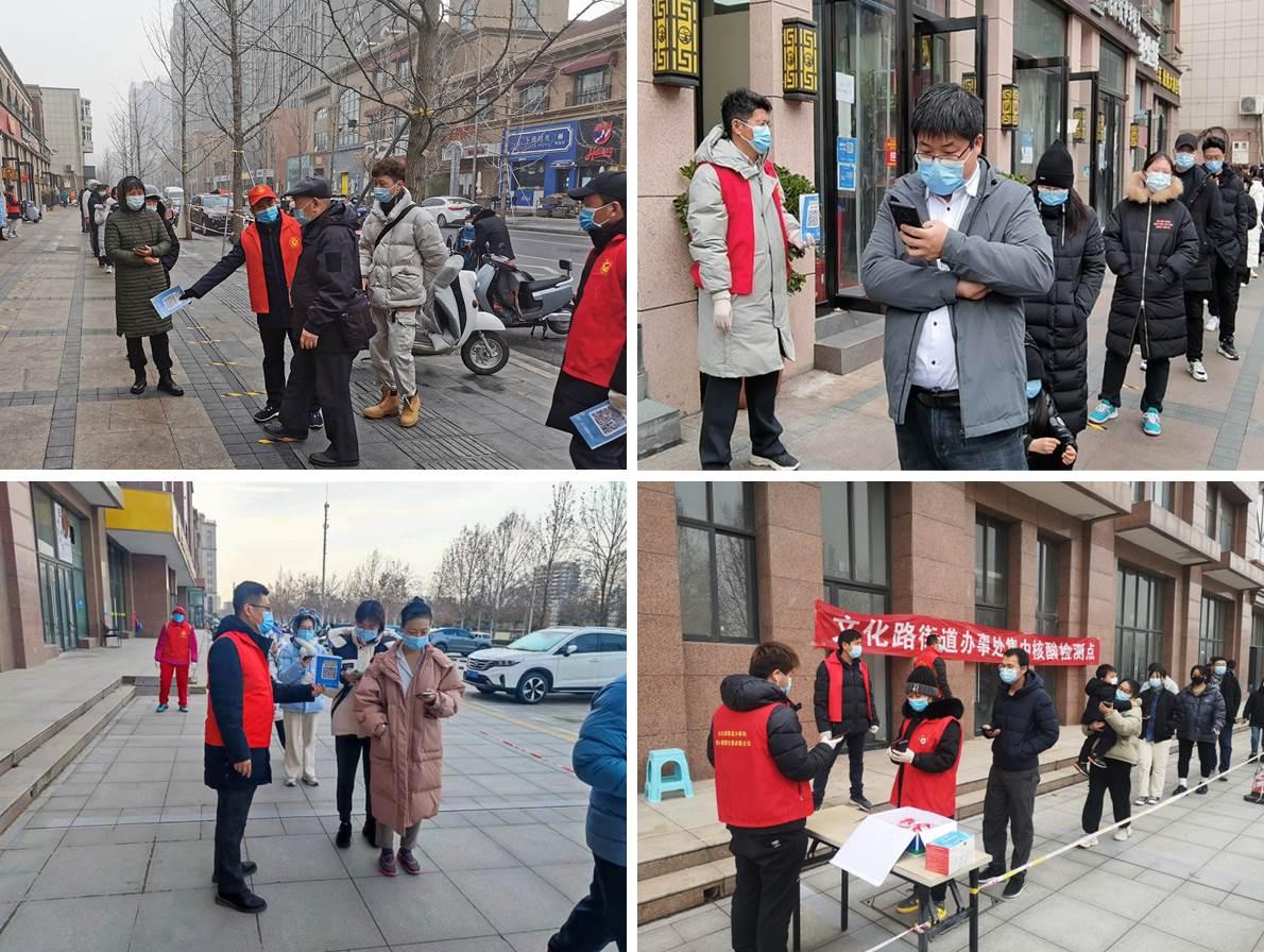 在文化路街道办事处核酸检测现场,随处可见“志愿红”们忙前忙后,有的搭建核酸检测应急帐篷,有的维持现场秩序、引导居民有序排队,有的搀扶行动不便的居民,有的负责登记检测信息,他们来回穿梭在队伍之间,一遍遍地提醒居民:“请提前准备好核酸检测二维码”“请大家保持一米距离排队”“请检测完的居民不要停留”……冬日的严寒,丝毫没有减缓志愿者们的工作热情。