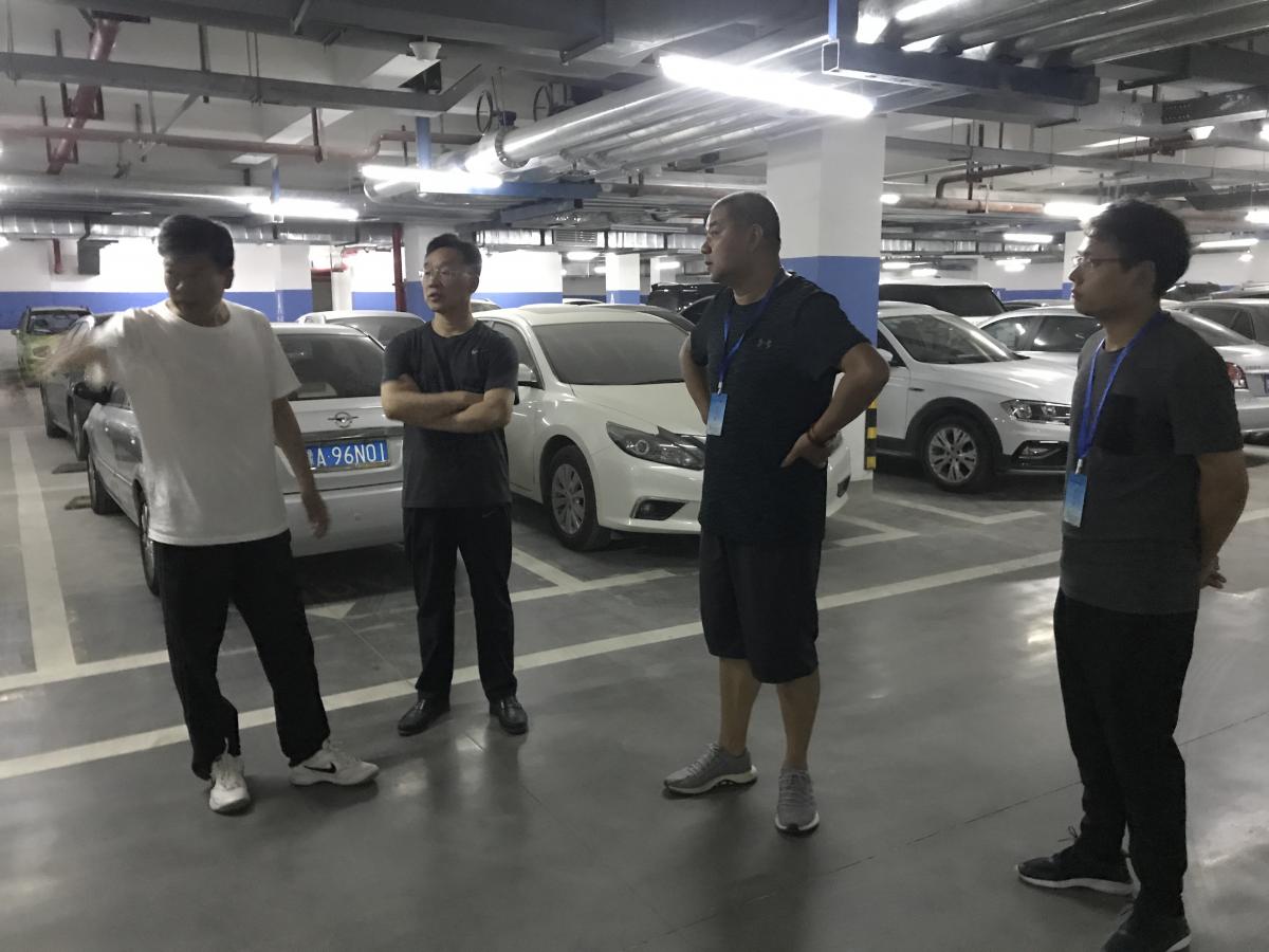 闫文斌总经理和马忠泽书记一行首先到C区车辆进出口视察工作情况,对业主反映较多的车辆进出口不方便的问题,实地调查测量,现场解决问题。