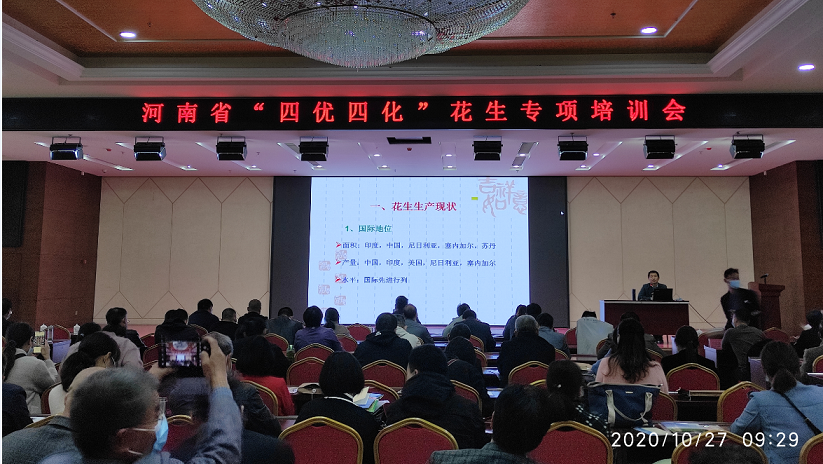 10月27日,河南省农科院农业质量标准与检测技术研究所在驻马店正阳县举办了“河南省四优四化”科技支撑行动计划花生专项技术培训会。会上,臧秀旺、刘继红、王铁良等相关技术专家分别做了《花生生产现状及发展方向》、《花生生产中黄曲霉毒素污染控制技术》及《绿色食品花生产地及产品认证》的报告,并对花生中黄曲霉毒素、水分快速检测技术做了现场展示。正阳县农业农村局局长刘飞、花生研究所所长余辉及相关领导、专家和基层农业技术人员等180余人参加了此次培训会。