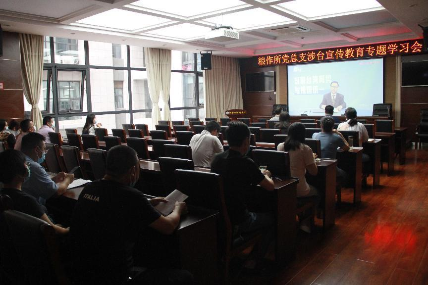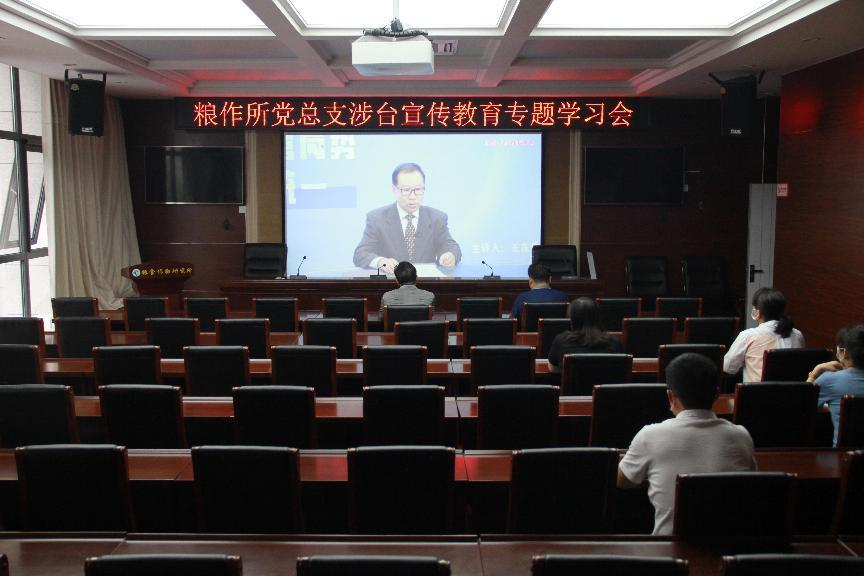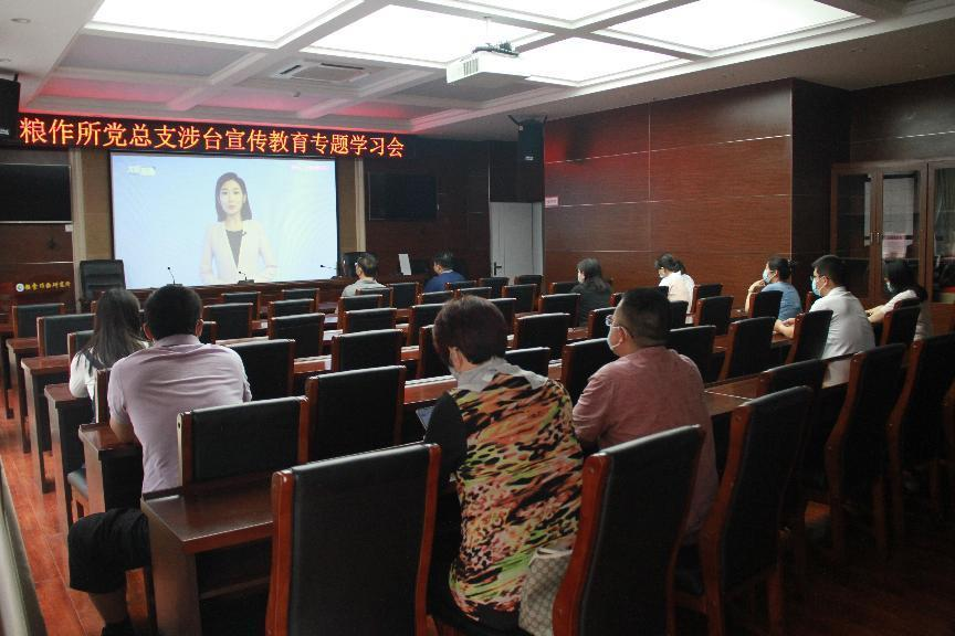 为有效开展涉台宣传教育,更好了解掌握中央对台大政方针,7月12日下午,粮作所党总支组织在职党员观看了大象新闻客户端首场直播,听取全国台湾研究会副会长王在希以《当前台海局势与祖国统一》为主题进行授课。所长郑飞,党总支书记黄保参加学习。