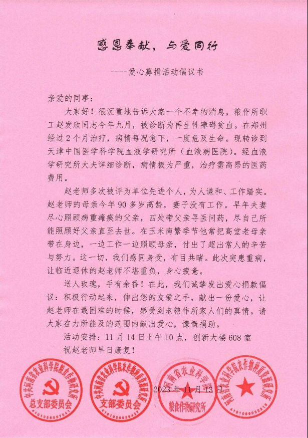 今年九月,临近退休的粮作所职工赵发欣同志突发疾病,病情极为严重,治疗需要高昂的医药费用,让这个原本不富裕的家庭雪上加霜。粮作所党总支、种质资源所党支部共同向两所职工发起《感恩奉献,与爱同行》爱心募捐活动倡议书;本着自愿的原则,两所干部职工积极献爱心,伸出友爱之手的有退休职工、科研助理、在读研究生,还有远在海南南繁的职工,本次活动共筹集爱心善款65400元。