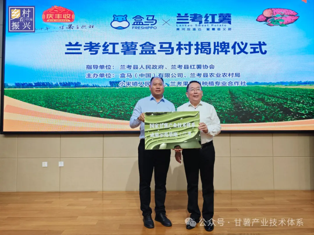 会议期间,国家甘薯产业技术体系首席科学家李强研究员为兰考县“国家甘薯产业技术体系成果示范基地(兰考)”授牌。之后,“兰考红薯”区域公共品牌设计方解读了“兰考红薯”品牌设计思路、建设成果及未来展望,同时,盒马鲜生负责人向兰考县为河南省首个“盒马村”授牌。这些都标志着兰考甘薯产业在科技成果示范转化、品牌建设方面迈上了新台阶。