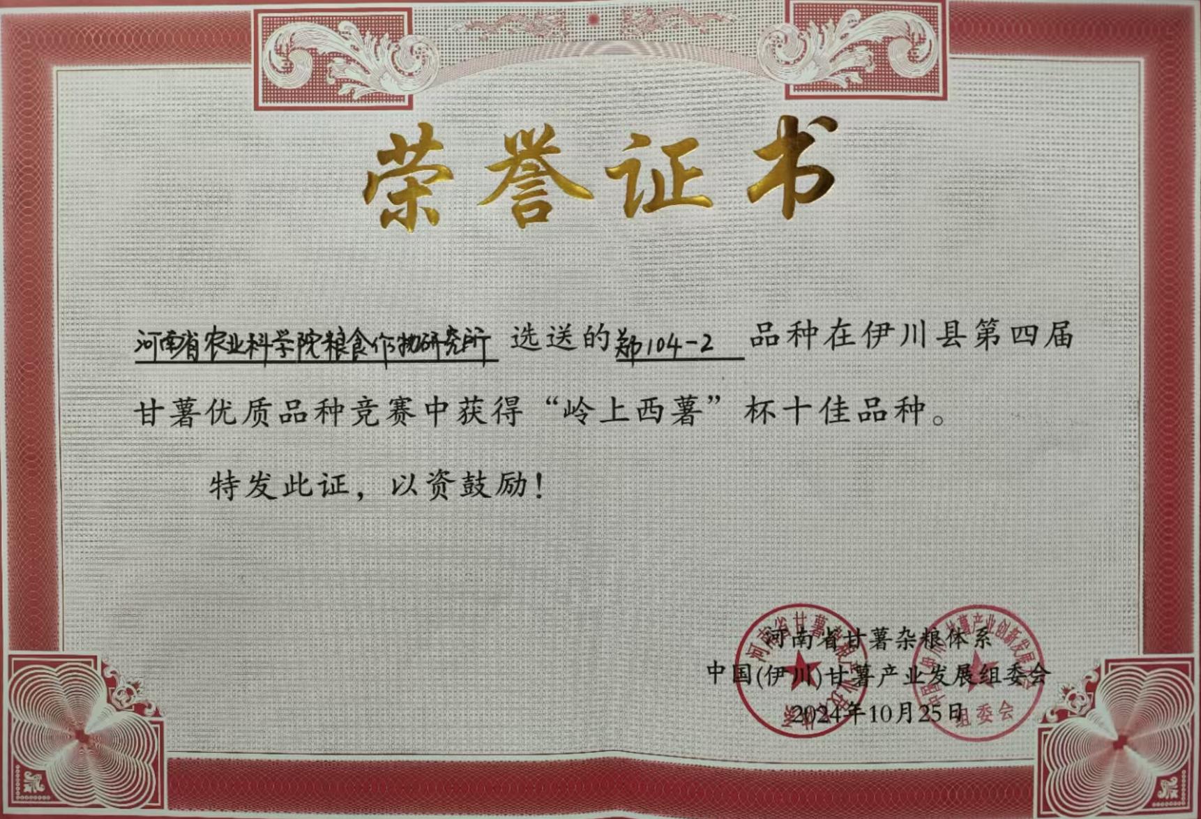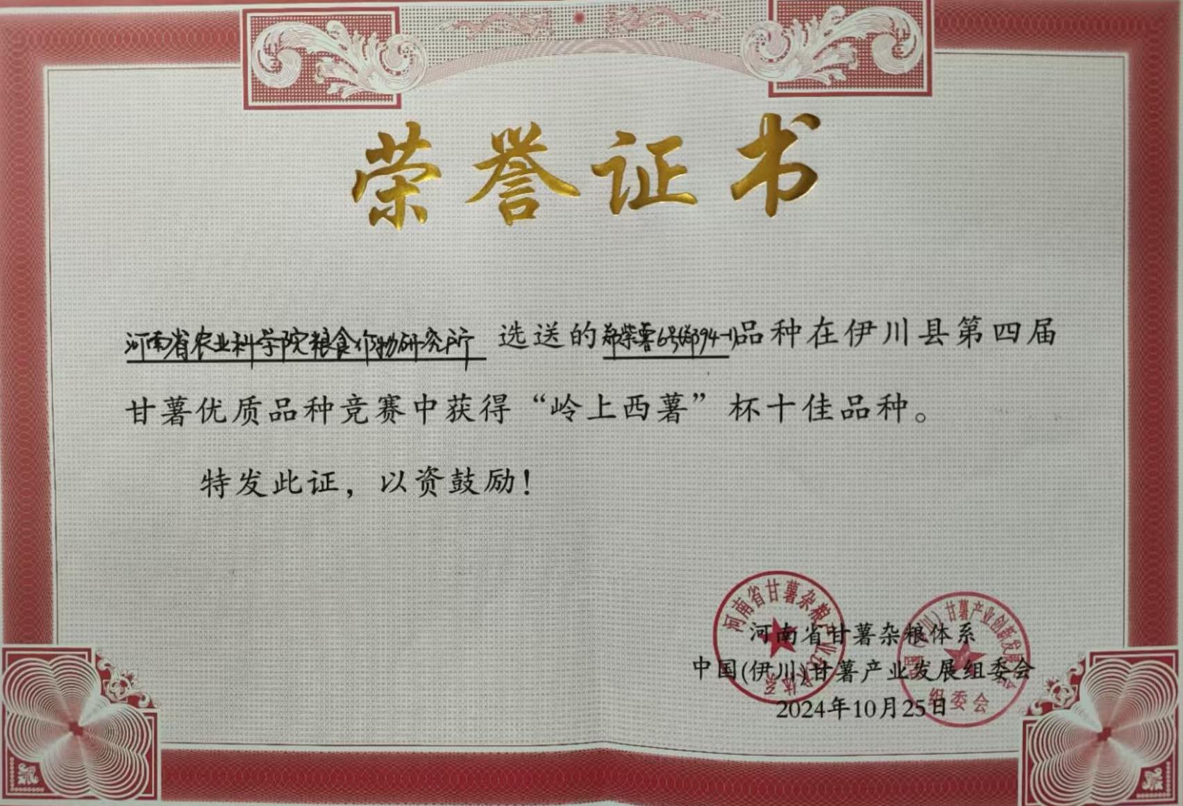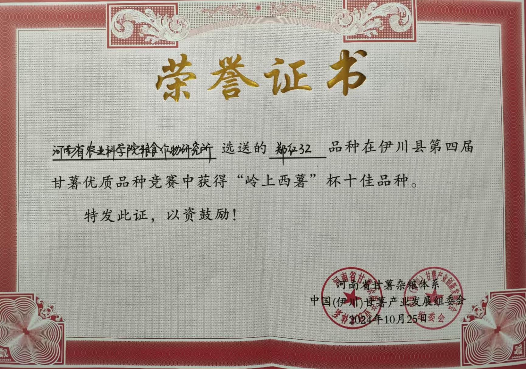 在伊川县鸦岭镇的甘薯新品种展示田里,来自全国的38个鲜食型、淀粉型和紫薯型甘薯品种同台竞技。评委专家及现场政企代表采用盲评方式,从产量、外观、食味三个方面进行综合评价,最终我所选育的郑紫薯6号凭借其大幅领先的产量、光滑一致的薯形以及绵软无丝的口感,得到与会专家及种植户的一致好评,连续两届获得紫薯组第一名,我所选育的郑104-2获得鲜食组第二名,郑红32获得淀粉组第二名。