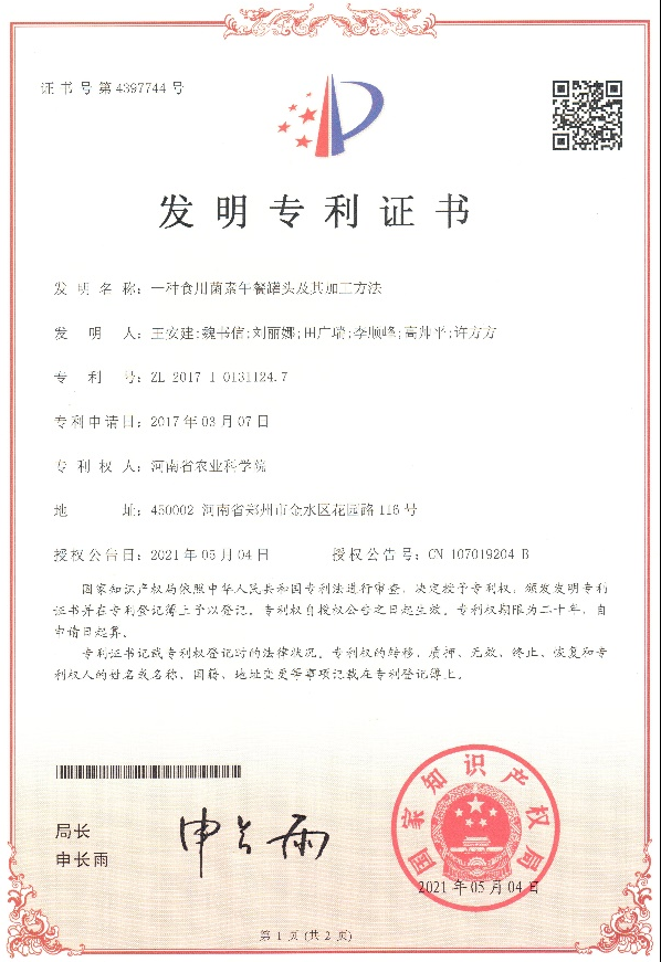 预期效益:食用菌素午餐罐头不添加肉类成分,具有不含胆固醇和亚硝酸钠等优势,食用安全性更高;罐头以食用菌为主原料,具有营养丰富,高蛋白、低脂、低热量的特点,口感接近肉类纤维结构,又兼具食用菌的独特风味,可满足人们对于午餐肉罐头的素食化需求,市场前景广阔,预期效益良好。