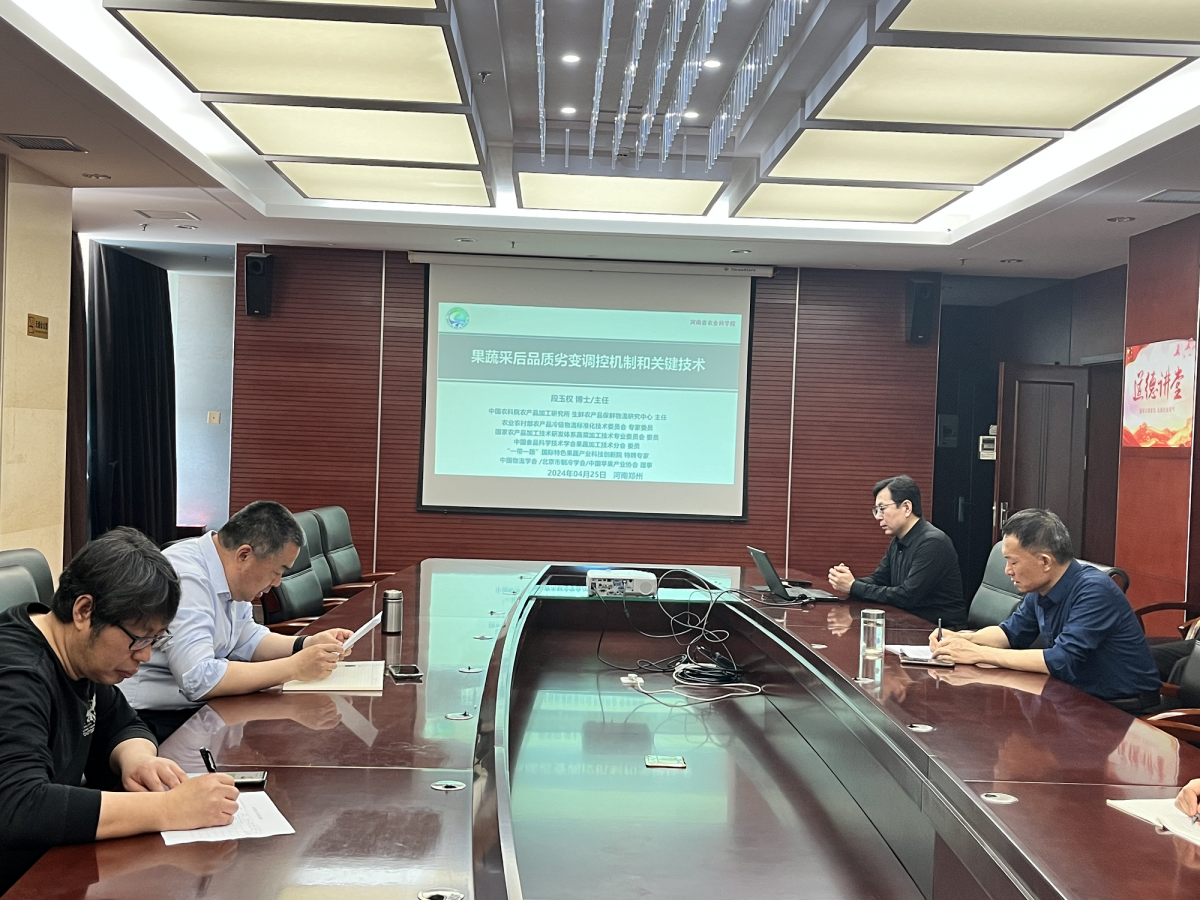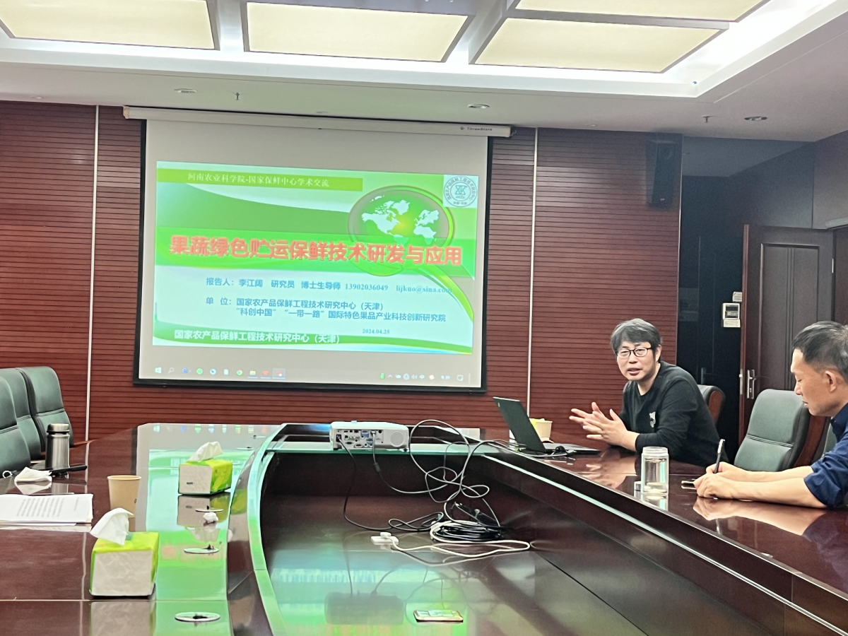 2024年4月25日上午,中国农科院加工所生鲜农产品保鲜物流研究中心主任段玉权研究员,天津市农业科学院国家农产品保鲜工程技术研究中心(天津)李江阔研究员应邀来我中心交流座谈,并分别作了题为“果蔬采后品质劣变调控机制和关键技术”和“果蔬绿色贮运保鲜技术研发与应用”的学术报告。报告由我中心副主任黄纪念主持,中心20余名科研人员及院蔬菜所相关科研人员参加了报告会。