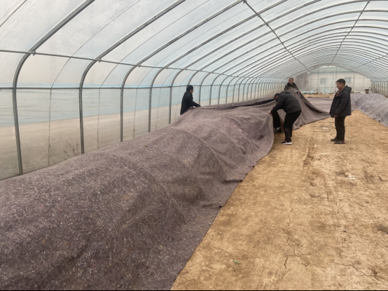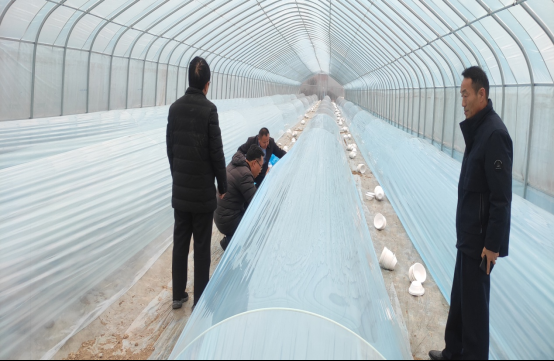 在夏邑县王集镇彭井村,小分队查看了河南农科院“优特计划”示范基地宝存种植专业合作社大棚春白菜育苗防寒管理情况,帮助基地负责人覆盖毡棉、紧固棚体、压严棚膜,并提出了在棚内张挂二膜和增加出入口风挡等保温措施。
