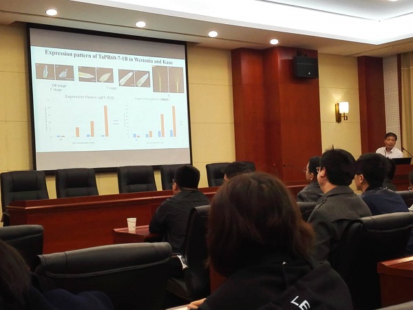 马武军教授首先作了“1B/1R易位系小麦产量和品质形成机制解析”的学术报告,来自所内外数十名科研人员聆听了最新研究进展的学术报告并进行了热烈的探讨。随后马教授一行参观了小麦研究所品质实验室并进行了学术讨论,然后又到24足球直播现代农业研究开发基地进行了小麦育种材料的田间考察与交流。