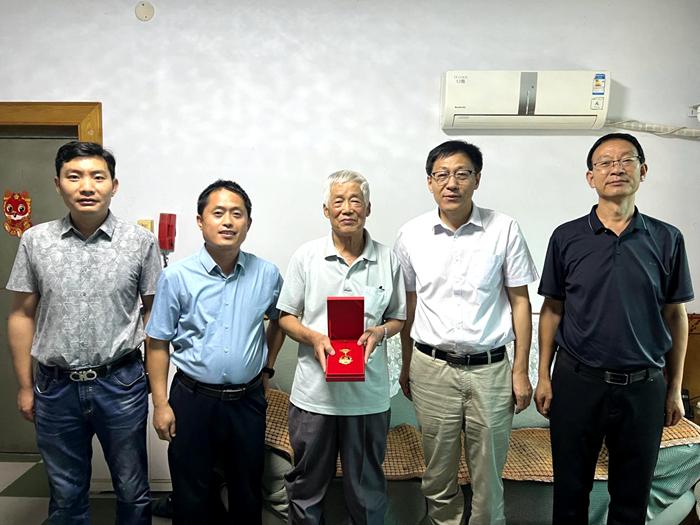 慰问现场,尚泓泉所长为郑文华同志授予“光荣在党50年”纪念章,同时为老党员送上党员慰问金。