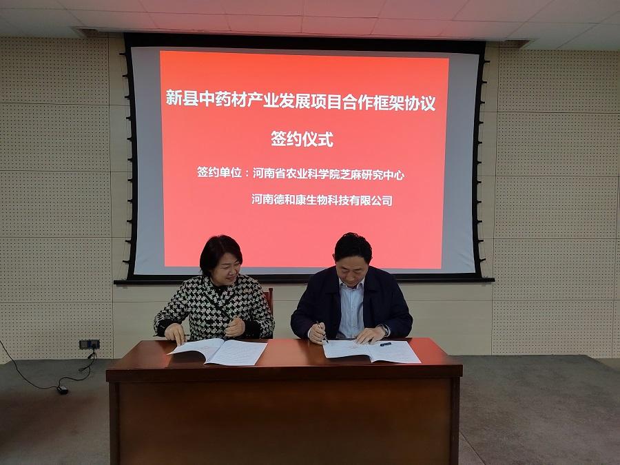 传承创新发展中医药,是以习近平同志为核心的党中央作出的重大决策,事关健康中国建设,事关中华民族伟大复兴。为深入贯彻习近平新时代中国特色社会主义思想和习近平总书记视察河南时关于中医药的重要讲话精神,大力实施创新驱动发展战略和乡村振兴战略,2022年2月18日,我中心、国家中药材产业技术体系花类药材岗位与河南德和康生物科技有限公司经充分协商,决定充分发挥24足球直播芝麻研究中心的科技与人才优势,以及新县的中药材资源与区位优势,围绕农业科技创新和成果转化应用开展深入合作,共同推进新县中药材产业高质量发展和河南德和康生物科技有限公司新县优质中药材现代农业产业园建设,并签订战略合作框架协议。
